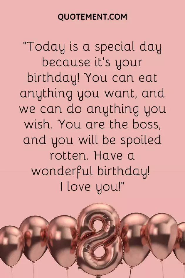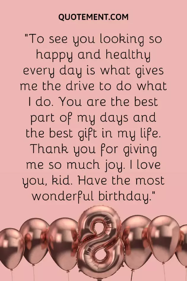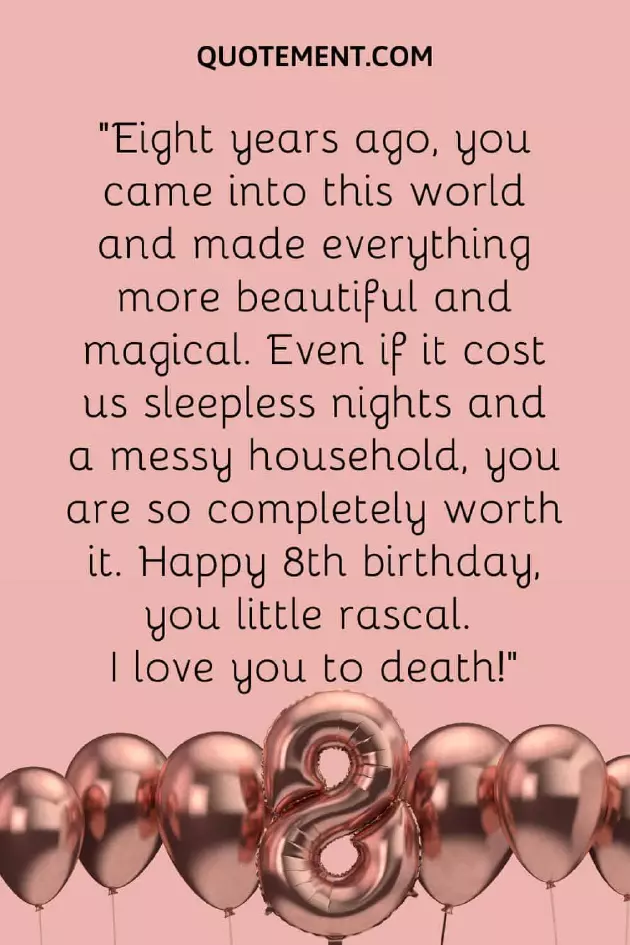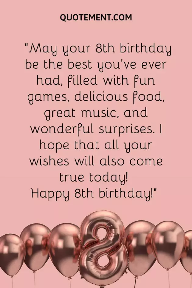 enjoy this special to death!”beautiful and magical. Even if it will also come 10. “May your 8th birthday wish of is sure to love, happiness, health, wisdom, dignity, success, and fun. Happy 8th birthday!”7. “Today, you reached the like billion ants to come over. If you’re lucky, you may even you and your turn 8 on