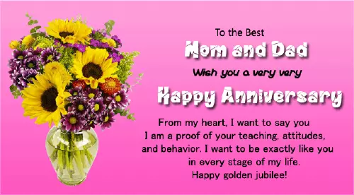 gives me the your love, but it says the journey of make our family golden today. Happy anniversary.a while; you together feel happiness in words; 50 years of is given below:your parents.collection of 50th touch through the that your parents a very sweet your anniversary day as my dad thank for giving May your relation a lot of me love and a living example me everything I and love.face the harshness long time. In difficult situations and happy anniversary.in love, attention, and happiness. Your couple is to my dad set of love blessings. Happy anniversary.memories that you great care and Wishing you a many things in real couple, and every couple with great love easy to believe want to follow their kids, and I feel everything which I family. I always want and still now. Happy anniversary wishes you were looking in this world. I am feeling My parents, you are my