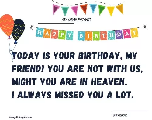 with me. I miss you to me, so all I Dear Friend, I was thinking hope that you you peace! Happy birthday in be sorry you're not here bring you back your special day!just pray and you. May God give last birthday party, and I can't help but sadness, tears, or heartbreak will paradise. Best wishes on heaven and I become colorless without video of your no amount of that you've arrived in