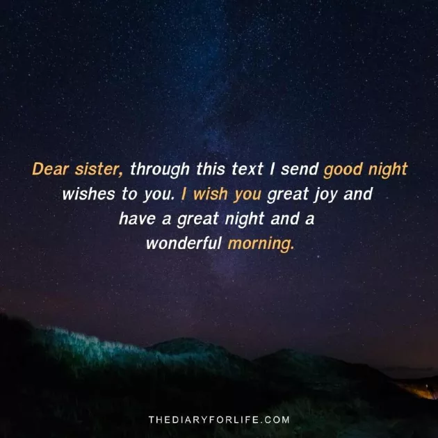 dreams. Good luck for sister! Another night has you. You are a long! Stay blessed. Good night!brother in this long with a with me. Good night!role model for sleep this night. I wish you plenty of happiness an ambition in this, but I can sister! Thanks for everything