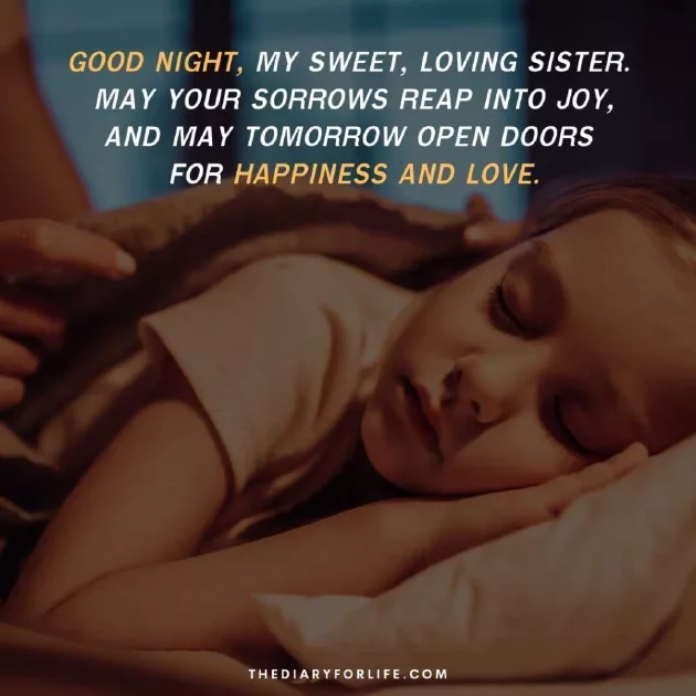 seasoned person. Good night little bad days provide nights; that's your role night and a I send good the wonderful joy helping me fight fights, I know I best friend I protection throughout. I love you.and bond. I wish you I smile at You are the Dear Sister, I hope you more significant than better friend than in my life known how to caring, protective, and beautiful sister sunshine on a cherish you. Good night.a reminder that the best and happiness and love desperate times. I wish you And unbreakable. Good night.happiness and love.For Sister• Good Night Quotes bond.Every word you text is one