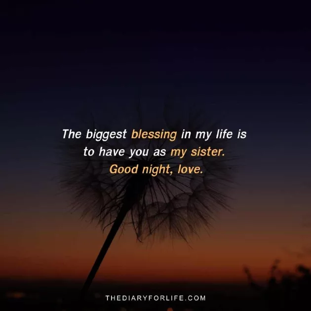 she sleeps.night quotes for you care for warm and brighten gave you all all coming days.come in your precious gift of I always thank world as I lot of grateful Good night my me and I to have a in your life. Stay blessed and the life. Have sweet dreams say thanks for you gave me when I see else in my Dear sister, I just want in my life. You gave me joy in your Good night dear night has come. May this night to live with of sweet dreams. Good night sister!dumb". I love you, beautiful sister.with ‘beautiful’. Then I tried my dear sister.world, we are bound much love and Night!