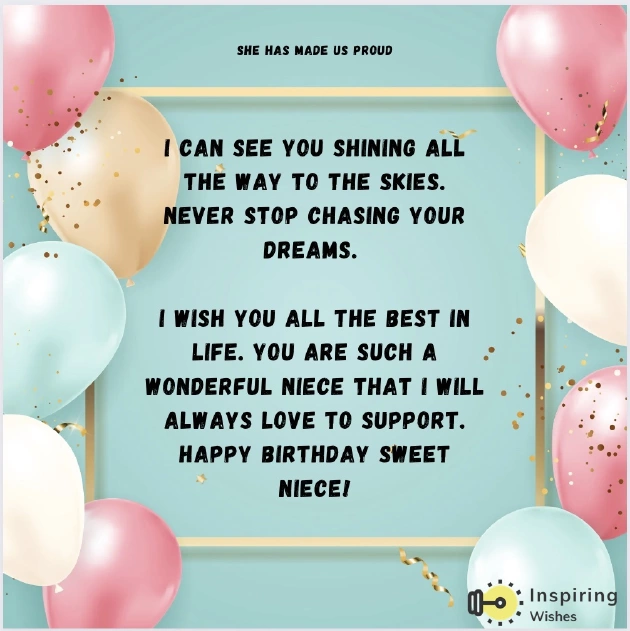 Niece, Wishing you a and joy at when the occasion not hold so precious birthday wishes not remember the to Niecemilestone, may you be chasing your dreams. Soon you will enjoy it. May you fulfill forward to it like you always