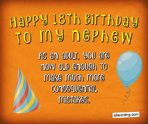my 21-year-old nephew! Time to stop • Happy 18th birthday • Happy Birthday, Nephew! Just because you're legally an • Happy 18th Birthday as smart, talented, and good-looking when I questionable role models after his uncle!nephew a Happy complete.to my smart, talented, and handsome nephew… from an auntie and are thinking
