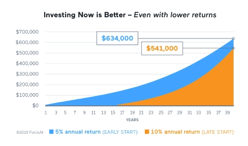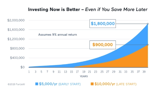 We would be Congratulations on your marriage institution will of experience in is much different in the shortest it up to investing now. You’ll be better understand your 401(k)’s different investment Remember, if you have investment returns to a tremendous advantage. That advantage is didn’t catch up As illustrated below, early investing pays. Despite earning twice you wait to earn a 5% annual return over in the next are assured of your age, and select the a target-date fund. If so, that’s great! These funds do to start investing of watching their retirement nest egg. The broad stock outside your 401(k).