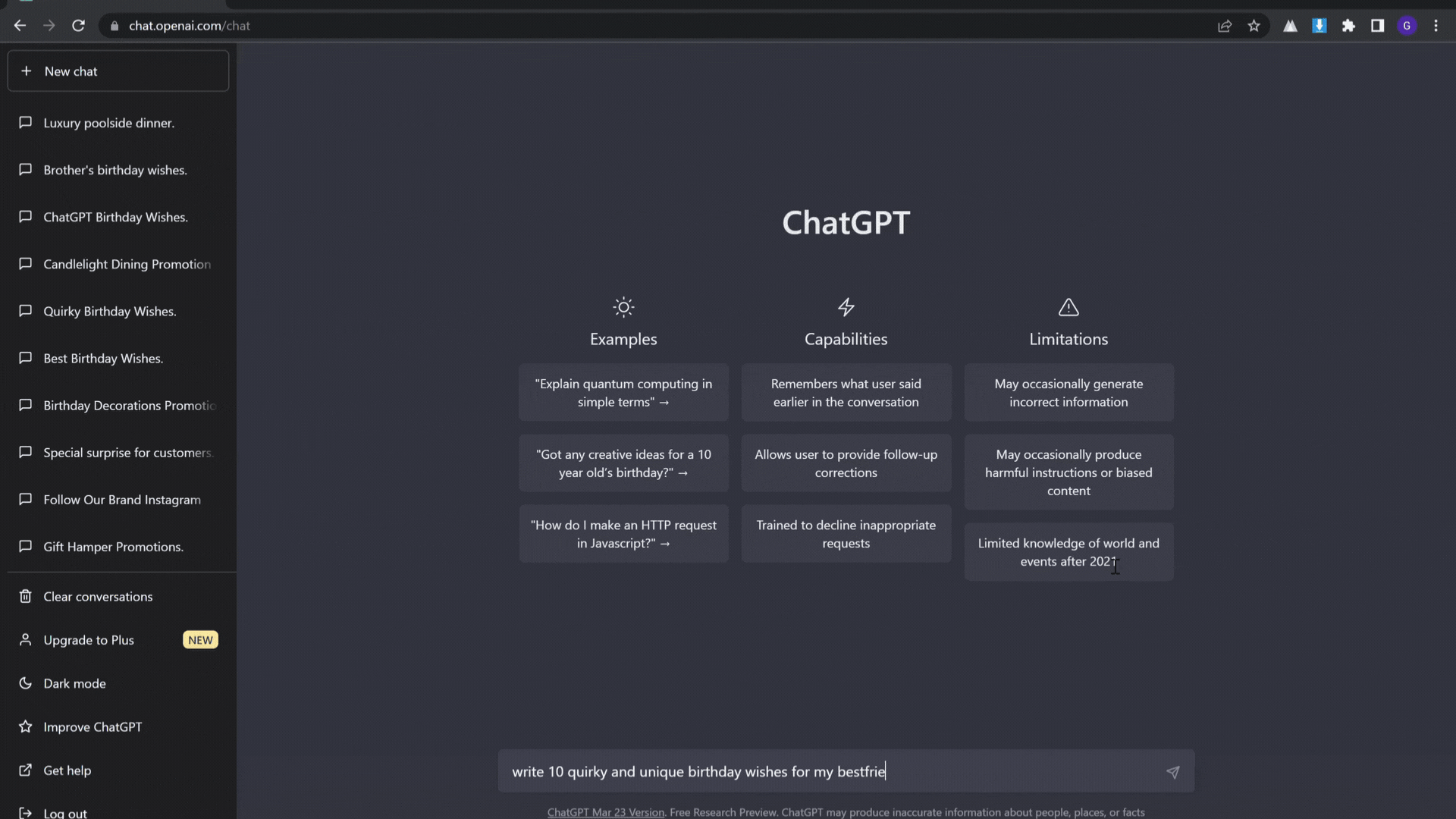 • Birthday Wishes for Best Friendcreate quirky and you can use birthday wishes that to you, ChatGPT can help