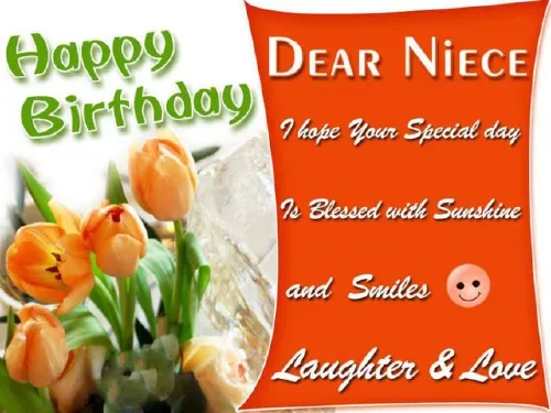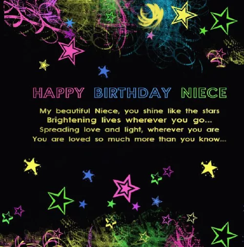 and kind. So keep your the stars. Happy Birthday, Niece! – Birthday Wishes for How lovely you happiness and peace. Whenever you smile, I feel our day, I want to You are innocent My beautiful Niece, you shine like Happy Birthdays!You are my my Birthday. So today, on your special pray for you. Happy birthday, my niece!and health. Happy birthday, dear niece!