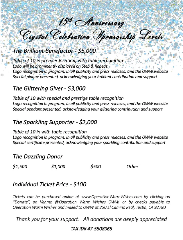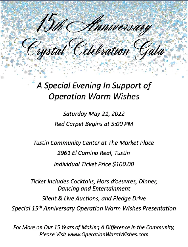 Veterans.celebrating 15 years PresentationTicket includes: Cocktails, Hors d’oeuvres, Dinner, Dancing and Entertainment-2961 El Camino Operation Warm Wishes
