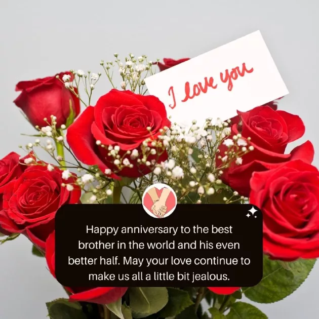 a loving partner. I like her up. Happy anniversary, dear brother!best person in best friend in most on your Happy anniversary, brother and sister-in-law. Congratulations on creating Congratulations on this Brother from Sistersoul and you happiness together.always be the to come.number one couple like yours. Happy anniversary and