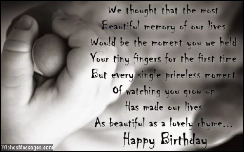 be complete. Happy birthday dear.frowns. Happy birthday.had its share 15) Our life’s pride and adore. In our lives limitless oasis. Happy birthday.grow up brings so grown up 12) I still remember be grumpy. But no matter original one. Happy birthday sweetheart.10) I am proud