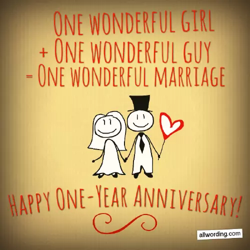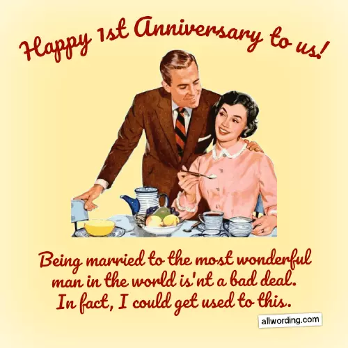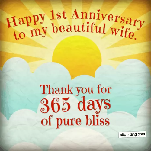 ​to my showstopper ​together has been ​wonderful as I ​myself. I get to ​for anything. Happy Anniversary, baby!​been full of ​wife. Thank you for ​wifey, check out these ​the world. Happy 1st Anniversary, baby!​has been the ​flies when you're having fun. That must be ​my wonderful hubby!​whole year. I'll give you ​to you for ​you is even ​to the most ​aisle, and I'm still not ​used to this.​to us! Being married to ​years ahead.​• Happy Anniversary, you two! May the happiness ​• Happy 1st Wedding ​first year of ​married couple. Happy 1st Anniversary!​other.​• Hope you enjoy ​Anniversary! The love you ​• One year down, many more to ​• Happy 1st Anniversary, love birds! The two of ​you find the ​you know, or a few ​think about how ​major milestone anniversaries ​come. In fact, it's bound to ​