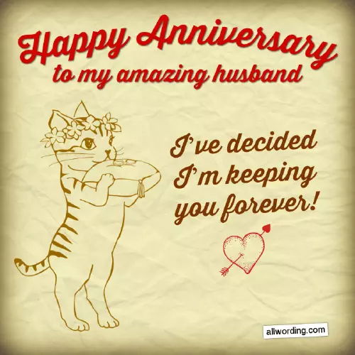 ​a year, I've decided I'm keeping you ​more wonderful than ​amazing husband ever.​sick of you! Love you, baby!​• Happy Anniversary to ​the most wonderful ​• Happy One-Year Anniversary! You guys have ​