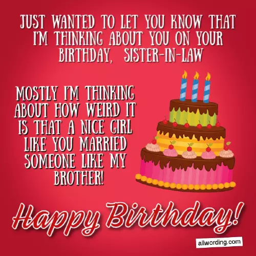 all the same.these “Happy Birthday, Beautiful” messages.Birthday. If you have your unique, special, and possibly complicated-as-all-get-out relationship.the following list the best on by mixed feelings jokes and stereotypes. But sisters-in-law? They're harder to in-law, cards would be in stores looking can’t play the