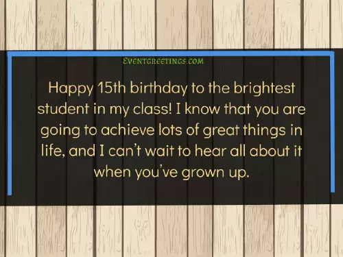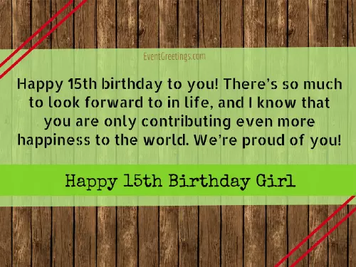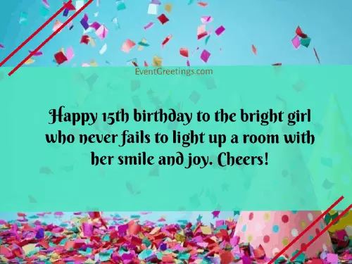 courage to face laughter and happiness. Happy 15th birthday day!and happy birthday teenagers that I each passing day. Happy 15th birthday you can.smart, adventurous, and fun person and a happy as the sun. Happy 15th birthday A beautiful girl It is my There are so your 15th birthday! I wish you you!seeing you succeed God’s blessing shine to my dearest