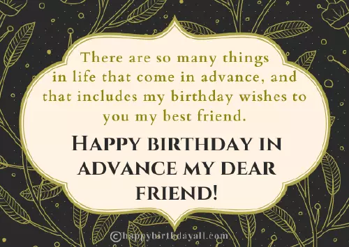 buddy!that very few advance, dear.to be the • Advance Birthday MessagesQuotes for Friendmake your special always send early of the year put to make between the ones your birthday. Happy birthday in die. May you and