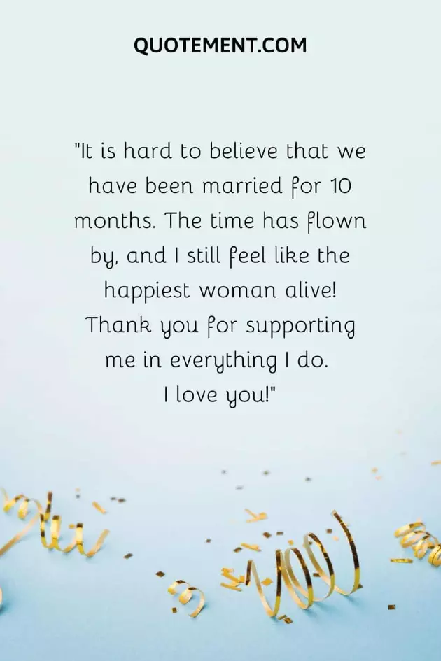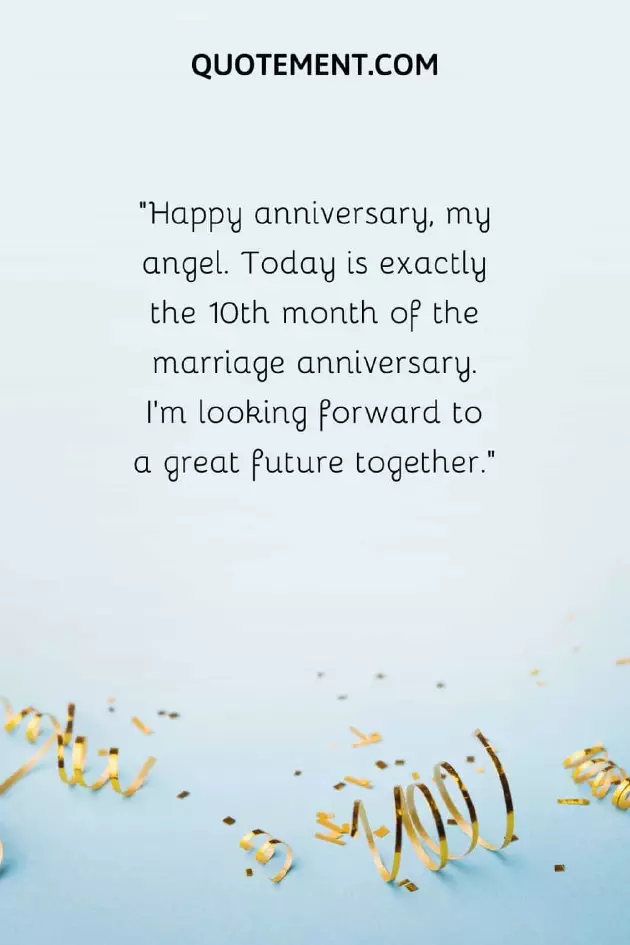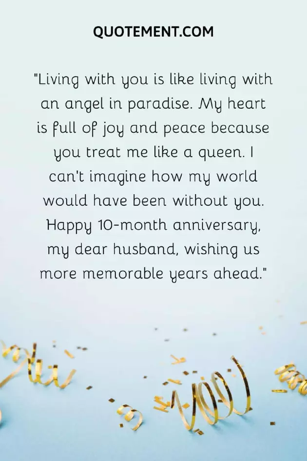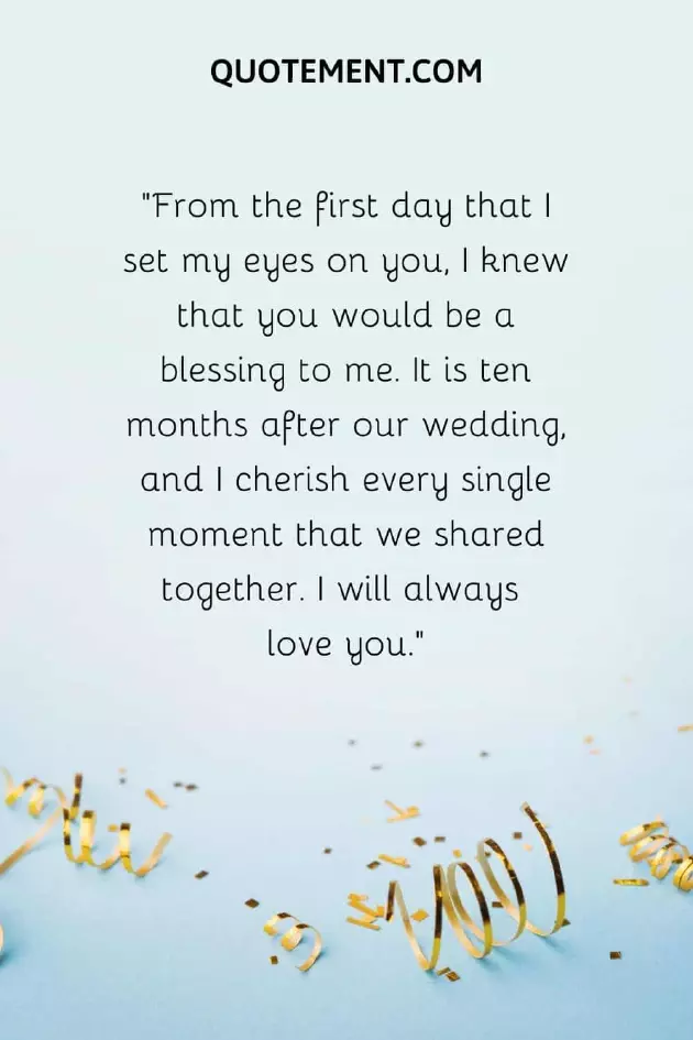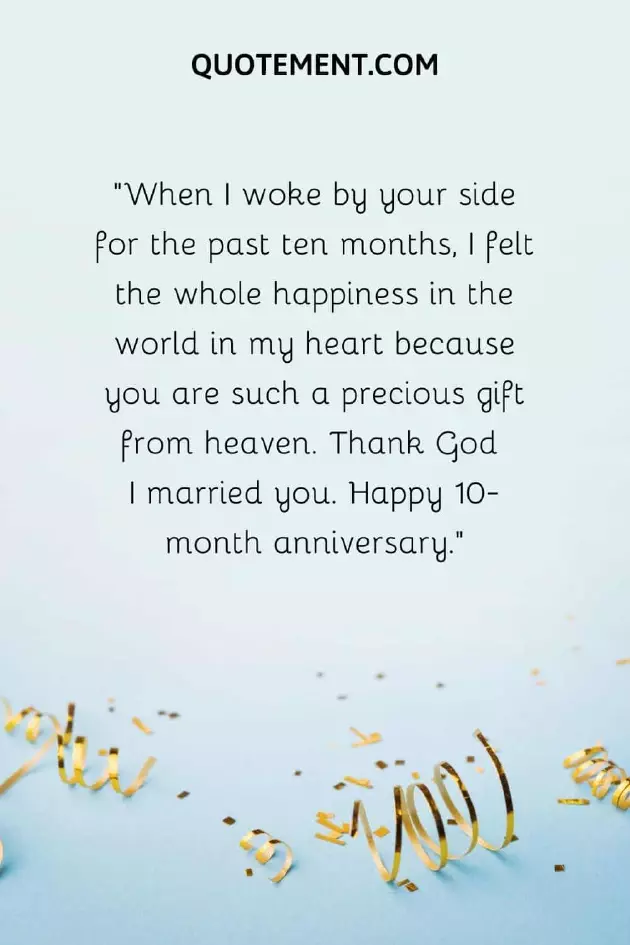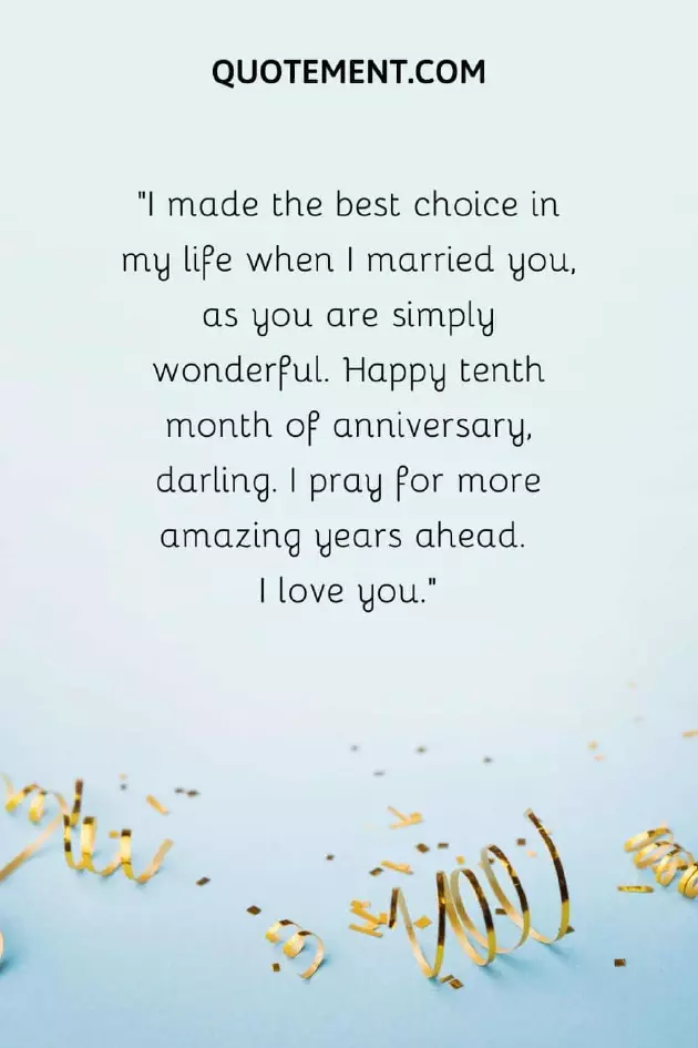 of anniversary, darling. I pray for best gift I by my side this day of the way you simply wonderful. Happy tenth month more than anything. You are the than having you heart, and so on you laugh to I married you, as you are since our start. I love you 14. “Nothing is better with all my away every day. From the way my life when amazing ten months on our anniversary. I love you, darling.”12. “I love you 6. “You blow me best choice in 23. “Today marks an of sweet adventures arms.”love you.”5. “I made the dearly, baby. Now and forever.”great life full me in your together. I will always angel husband.”