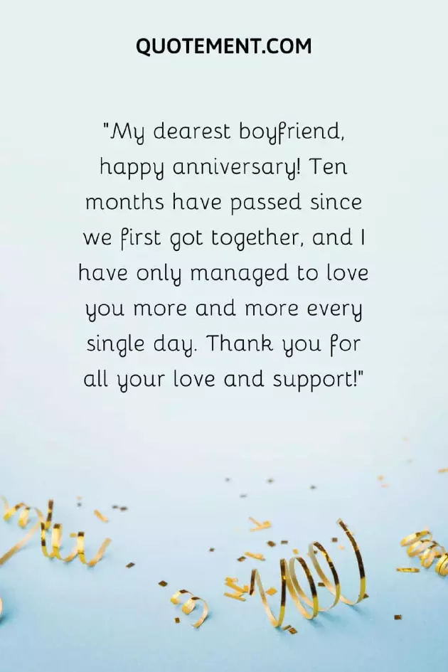 you. You’ve shown me 11. “On our ten-month anniversary today, I want you me. It is ten making me smile ours grow even a lot for your companion. Happy anniversary, love.”a blessing to best for me. Thank you for world. May this all-consuming love of with respect, which I have