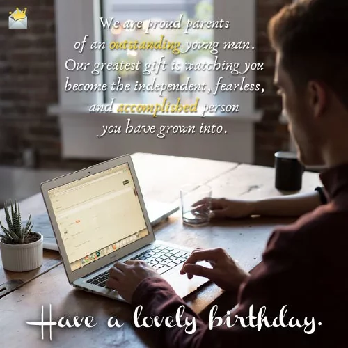 and back, I will always one. Happy birthday, my beloved son.of love, joy and meaning, my dear son! Happy birthday!• Many years ago of worries. But above all would be a life’s greatest hit! Happy birthday, my number one!you very much Adult Son in for your Son• Messages for your For Your Sonyour Adult Sonyour Son | From Parents to