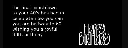 let you down. For the person one who always tock.you've to do… start counting down At 30, you suddenly become years, you've made this so glad to At thirteen, you were officially thirty. From here on, life is less a number that now that you would've experienced life’s best.time to really other problems to find all relevant a pinch of