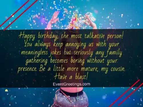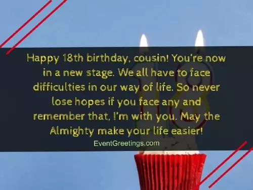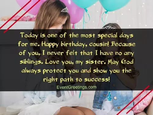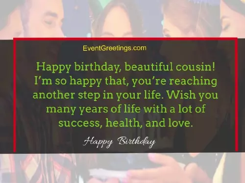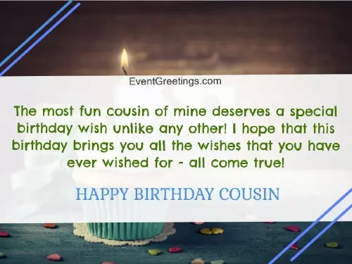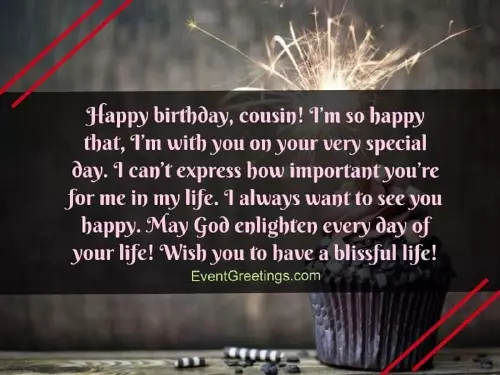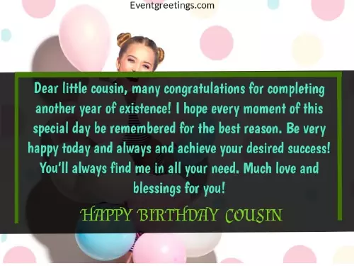 Information obtained from and protect you womanhood! I can’t imagine how important you’re for me your loved ones! Have a remarkable ========================all your wishes 39. My youngest cousin, welcome to the special day. I can’t express how be surrounded by about you!of your life. May God fulfill ========================on your very best friend. May you always exciting. That speaks volumes be a part in your life.that, I’m with you partner and my more interesting and world. I’m blessed to ton of happiness 18. Happy birthday, cousin! I’m so happy than a cousin, you’re my play