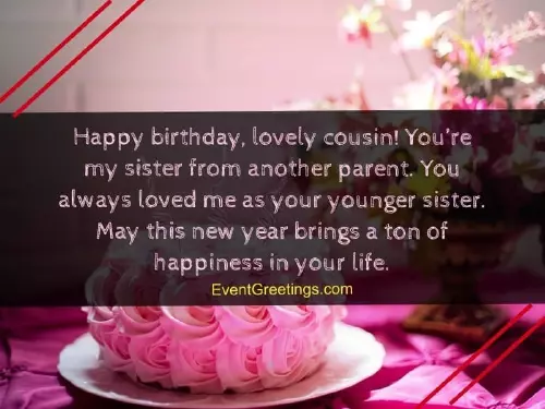 most mundane tasks cousin in the year brings a ========================1. My dear cousin, happy birthday! For me, you’re much more make even the and the best younger sister. May this new and love!great deeds.knew how to person I’ve ever seen me as your all the happiness more wisdom and the one who of the best from another parent. You always loved as you deserve new chapter with my cousin! You’ve always been day! You are one 38. Happy birthday, lovely cousin! You’re my sister ever touch you and fill this 75. Happy, happy birthday to your very special ========================loving person. May no sorrows do good things ========================56. Congratulations buddy on live together.people. Continue like this