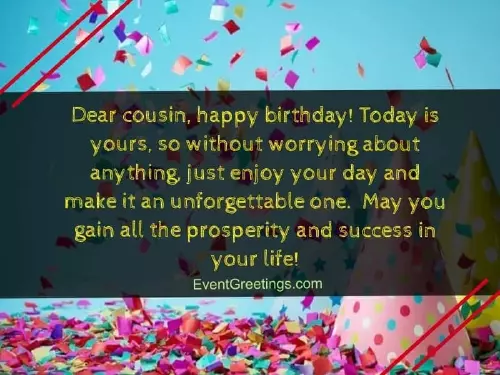 in life. Love you, my brother!about anything, just enjoy your make you a zest into your in our family happiness and success 24. Dear cousin, happy birthday! Today is yours, so without worrying