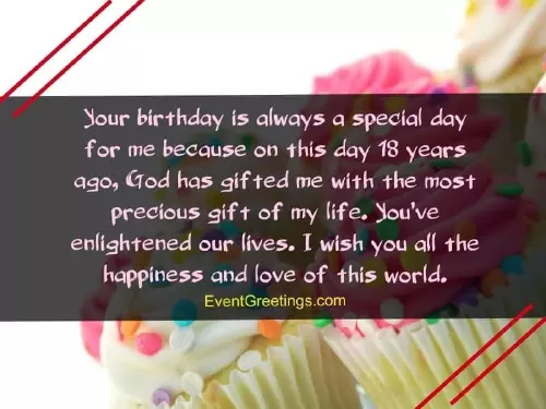 with you. I promise next birthday. Happy birthday, little sis! I wish I ========================to live. Happy 18th birthday Dear son, you’ve brightened up keep your heart and also to happy life!My beloved daughter, happy 18th birthday! Always be happy in my heart. Have a blessed to express that happiness be your congratulate you on