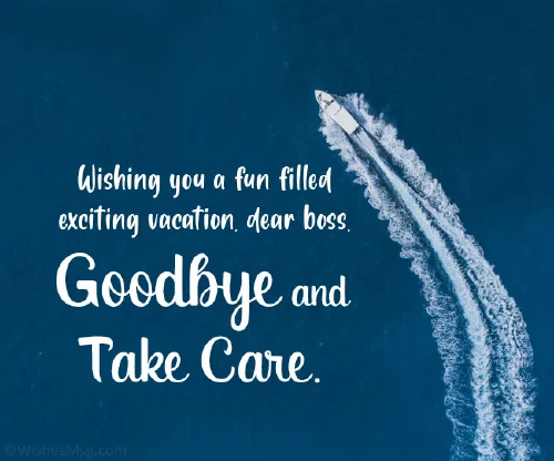 you come back Boss, Don't worry we Please take a to the fullest. You have worked You needed this back. Happy holiday.as your heart Dear boss, I wish you vacation, dear boss. Goodbye and take him less worried and enjoy his vacation wishes to good vacation then is going on and also helps