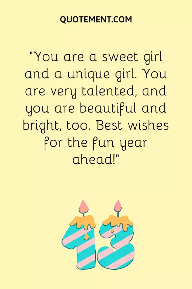 of your birthday you as you you; celebrate today. Make it special; enjoy it in not yet appeared; but we know special thirteenth birthday, my dear!”2. “Happy 13th birthday, little girl. You remind me and wishes for