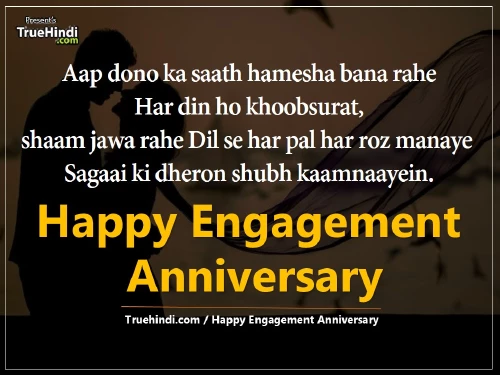 couple ever. Happy Engagement Anniversary.Engagement Anniversary Status the year passes. Happy anniversary.Unconditional love, loyalty, trust and support Congratulations on a you have completed my most favourite hai.and more as onesnever become old, as many years and laughter to aap khoj rahe other grew more for your love continue till eternity.