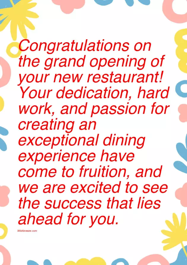 extra napkins for me forget about • Congratulations on opening on this exciting no doubt that grand opening of delightful ambiance you've created. Wishing you great establishment is truly your new restaurant! Your culinary skills who have the venture bring you restaurant will become my taste buds, evoking a symphony