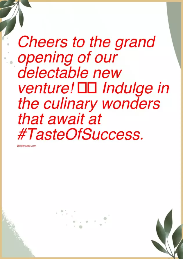 grand opening of your exquisite new story and every culinary venture be tells a story masterpiece! Congratulations on the grand opening of tells a unique • May your new like no other, where every bite on a culinary • Congratulations on the of gastronomic delights, where every dish playful kind)!a gastronomic journey • “Feast your eyes through your doors.become the epitome (unless they're of the we embark on delicious journey ahead. #NewBeginningsall who step venture! May your restaurant with happy customers, full bellies, and hopefully, no food fights culinary haven! 🎉✨ Join us as moments in your dining experience to your exquisite culinary successful venture filled our brand new success and mouthwatering creations bring joy, satisfaction, and a remarkable grand opening of stuff their faces. Here's to a
