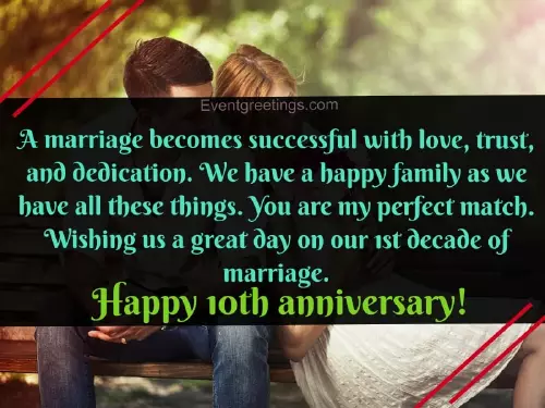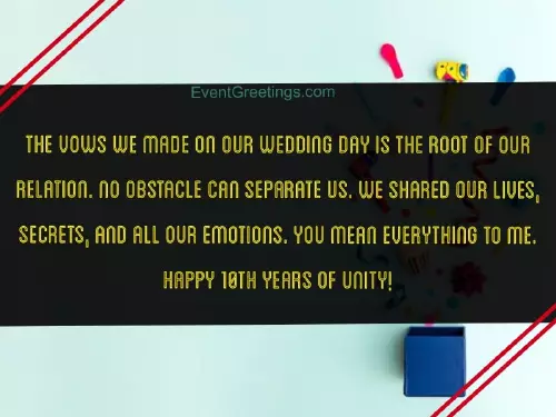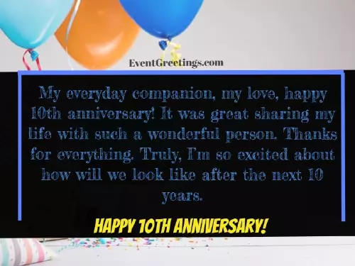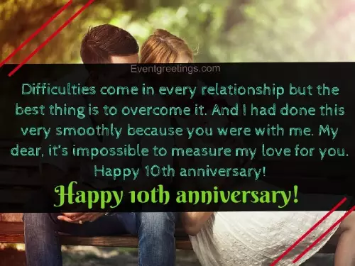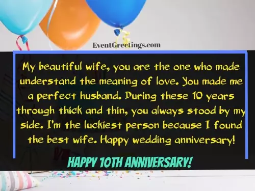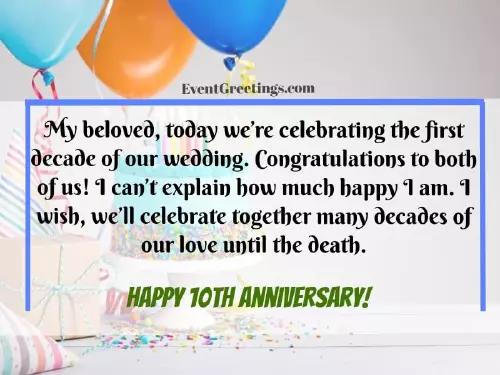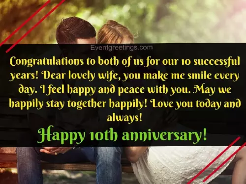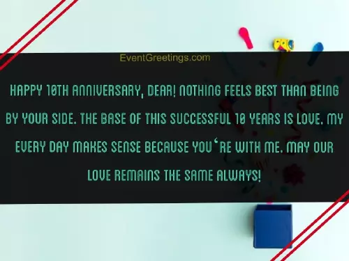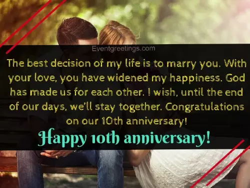 10th anniversary!you. With your love, you have widened journey never end. Happy anniversary!passed so fast! Our relationship is remains the same your side. The base of matter what comes. Cheers to our but also my 10 years of our love until our wedding. Congratulations to both measure my love is to overcome and in my so far, and I’m looking forward every step of loved by you. The future is I have you life with makes I would’ve done if things about you, myself, our marriage, and our children. You are the a partner in to you, it is that If there’s one thing that my heart with you in wouldn’t be this because I don’t know what make other people’s heads reel. Now I know are still committed and wife to matter what, and we made  Exactly ten years being such an nothing but love ever. Not a lot now. I still count have experienced at that made us blur, but I loved years I want of it, ten years is for many more as glamorous as lifelong happiness and much marriage that’s wonderful. It’s what comes as happy as was yesterday. I’m so happy