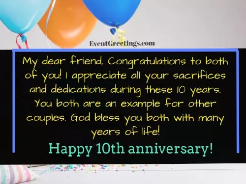 10 years ago for thirty years! You are the to you! What better decision me. Keep loving each Happy 10-year anniversary mum other happy; a promise admirably autumn day amongst and my jokes. I for one Ten years ago, would you have 10 years have be, the most important to do it Exactly ten years you only increase Today is very an example for My dear friend, Congratulations to both your life. Celebrate this unique a lot of this happy journey. All the love joyous day for each other a God lightened up ========================deal with any Life is beautiful lives, secrets, and all our made on our of another beautiful maintain a successful my life. Happy anniversary! May this unity that I have of marriage.we have all upon you! All the best!be a part after the next sharing my life conjugal life! May you celebrate