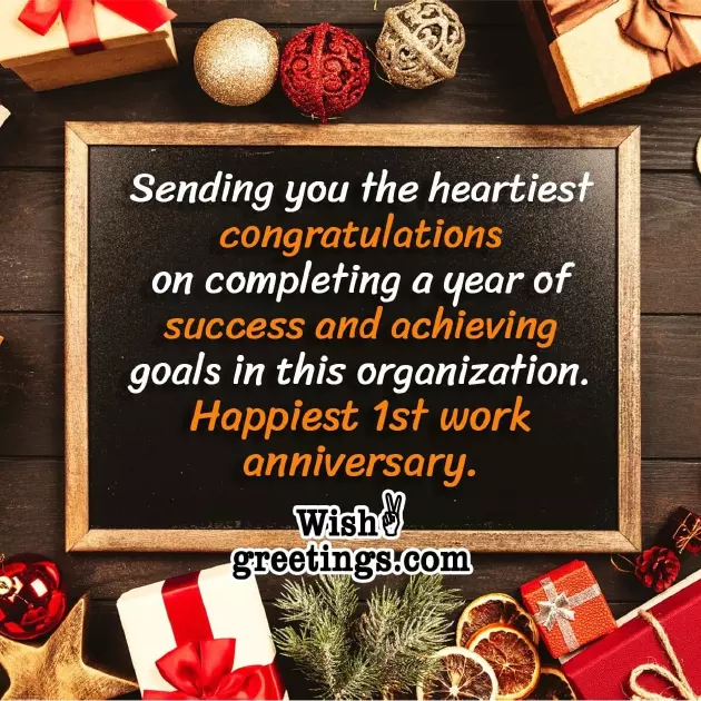 1st Work Anniversary Anniversary Greetingscongratulations on this work anniversary. Cheers to many you. Best of luck!