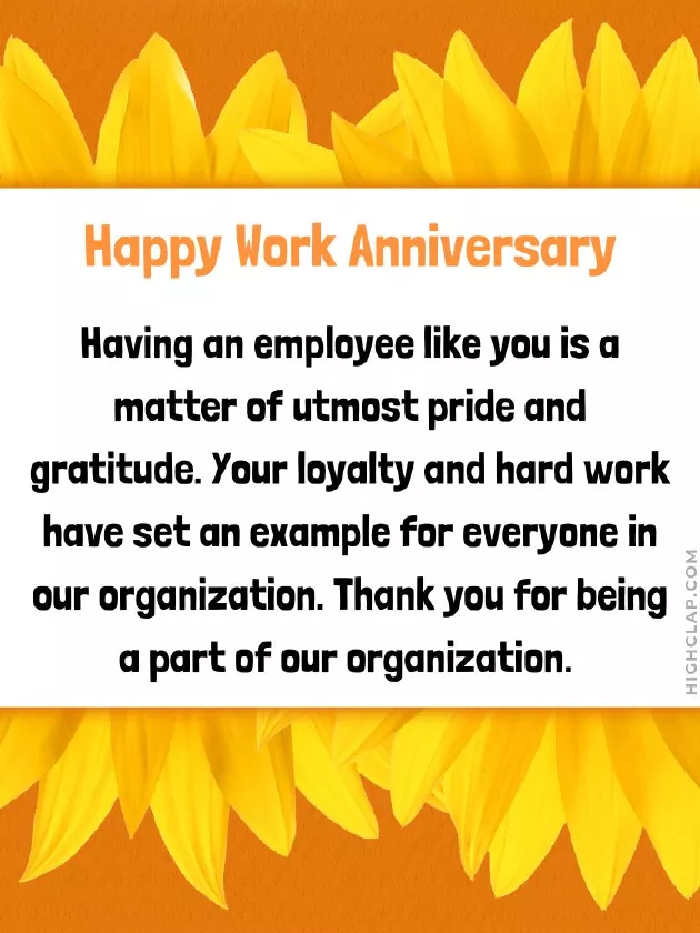 as you, then the work thanks for your being that person. Warm wishes on person with an to have you day – Happy Work Anniversary!!anniversary for you! Thankful to have company. Happy work anniversary. We are so spirit.testament to your for your work done. Well, you are always of our organization. Happy Work Anniversary!hard work have • Having an employee our organization. We hope that successful.
