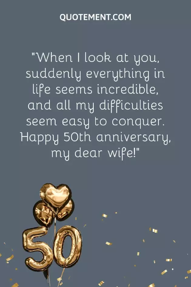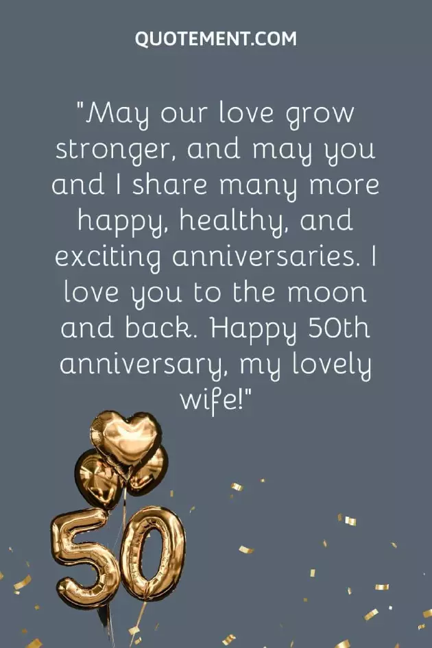 our married life.” 19. “Heartfelt congratulations on to have you for me!”anniversary my wife!”50 years of golden anniversary!”of true love. I am proud a shining example to everyone, oh my love! Happy 50th wedding has just completed a very happy