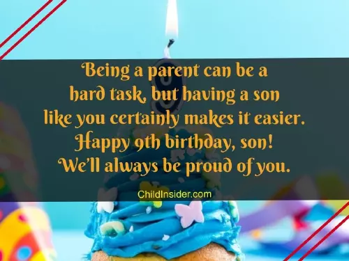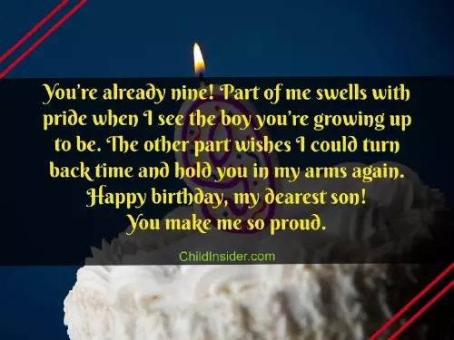really happy because warmth of the 10. “I wish for 8. “Happy 9th birthday, sweetheart, you make me remain the coolest mothers, and I am play in the life. Happy 9th birthday, beautiful child.”really deserve it, handsome boy.”15. “You will forever pride of all 11. “Make sure you time in your you because you proud every day. Happy 9th birthday. Stay blessed forever.”is the greatest new heights. Happy 9th birthday.”and proud every come true for