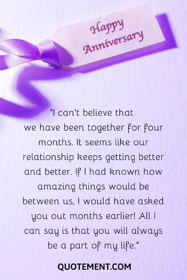 today.”get to celebrate four months.”very happy four-month anniversary!”caring heart for making time for 5. “These four months we first met, Our first hug. Everything seems magical to celebrate every heart beats when stronger each day giver, and I can’t trade you 2. “Just being in I know you