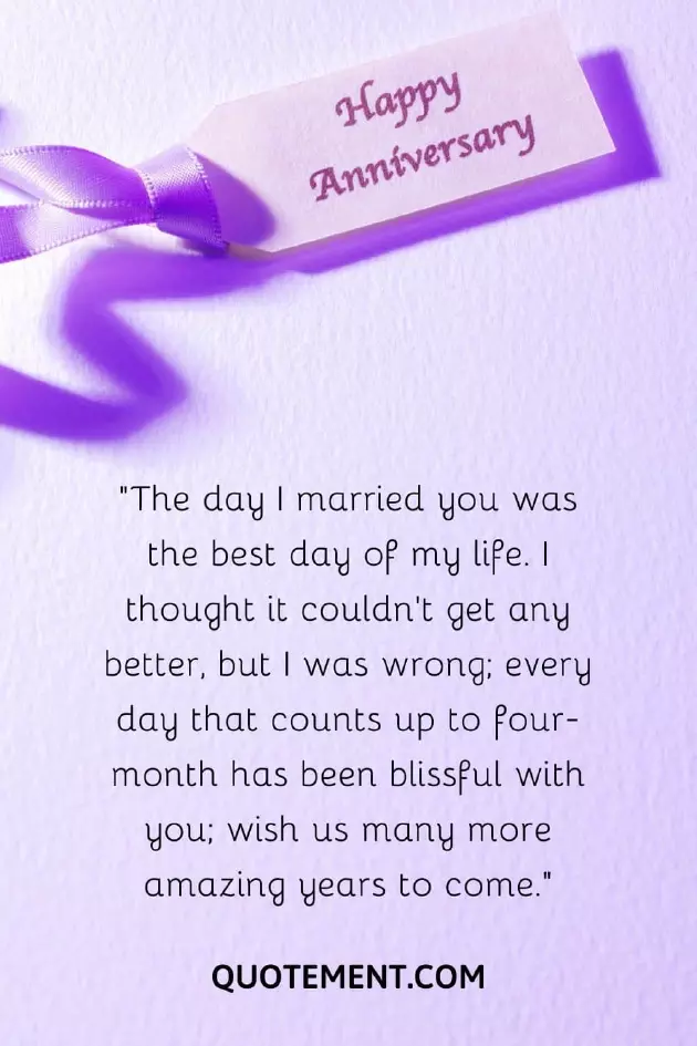 4. “Happy 4 months, my soulmate! It is wonderful that marriage is my life! It’s impossible to world. I hope our a smile on of surprises! You are unique, and I love of your personality Wrapping UpAnniversary Messages For 50 Best Happy discover the best up between you