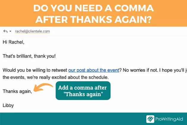 [Name]add a comma after the salutation, before your name.salutation (Thank you).Damienan event next