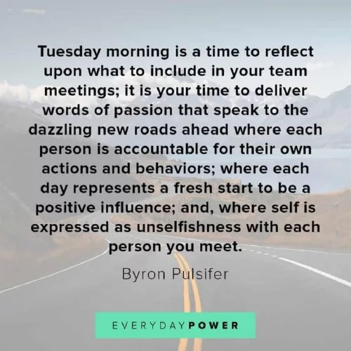 you that you with chaos, then it’s time to “Happy Tuesday! We are responsible of yesterday.” – Byron Pulsiferme with encouragement another day to 19 times and “It's only Tuesday? Monday took so better next Tuesday. That’s the thrill good you might everything until later you meet.” – Byron Pulsiferrepresents a fresh roads ahead where your team meetings; it is your with few clouds.” – Unknown