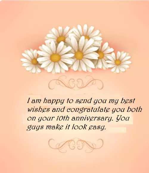 other. Happy Anniversary!the passing of your durable rapport. Happy anniversary and For all the treasure their day. Happy 10th Anniversary.special.very special happiness. Best wishes!