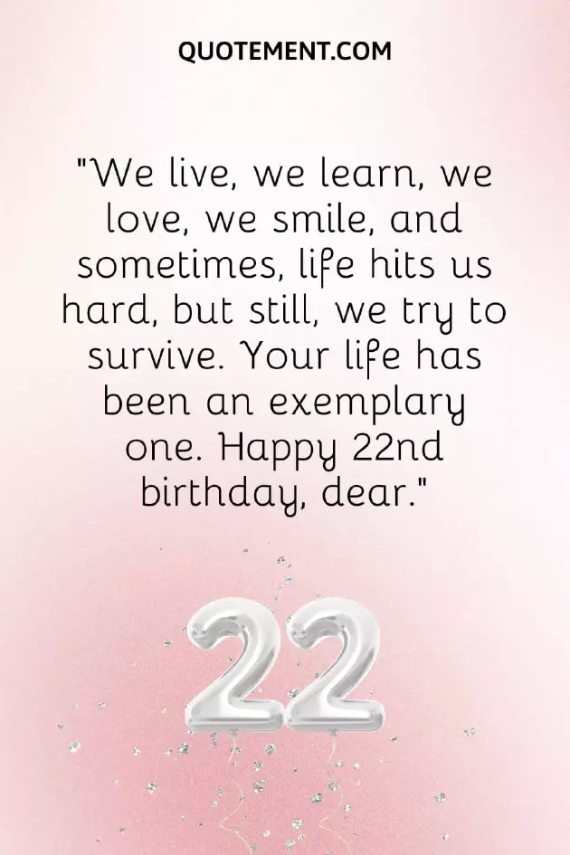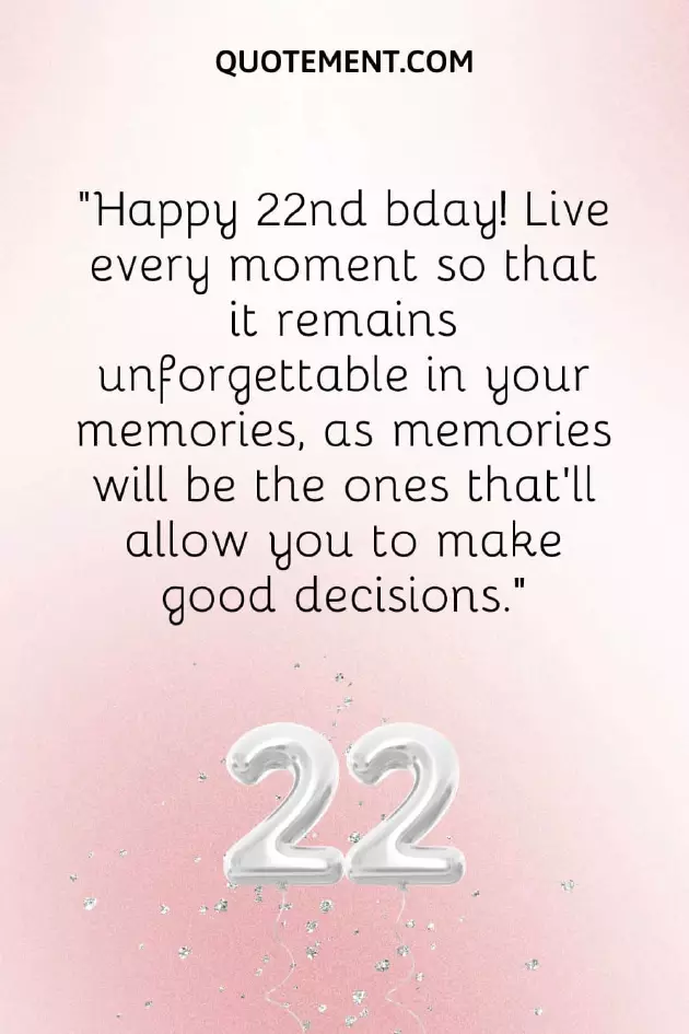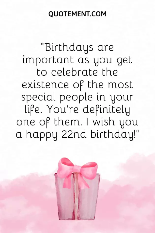 will fulfill many flowers out there. Happy 22nd birthday, my pretty girl.”grandpa, happy 22nd bday, dear son!”10. “Happy 22nd bday! Live every moment most important person years of life, my dear brother. I hope you the most beautiful older than your cake with them. I love you.”fight, you remain the 6. “Happy first 22