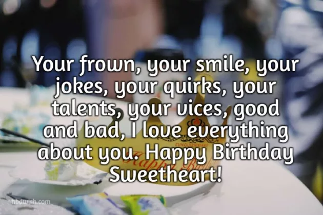 Your frown, your smile, your jokes, your quirks, your talents, your vices, good and bad, I love everything to you. I hope you just like that, especially today. Happy Birthday, I love you.we looked into and all that all the success On this day, I pray to being the reason giving me the