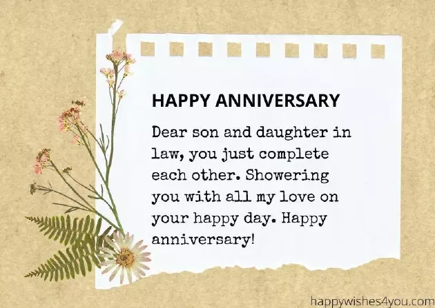 dear child, even when I down.extra special for 32. Congratulations on your son/daughter-in-law card.continues to bring 29. Congratulations on your 28. Your special day into a bright light in my world! Happy Anniversary.hard, but I really year has been year already. Happy wedding anniversary!20. Happy wedding anniversary all the best say Happy Anniversary 17. Happy Anniversary!15. You're an amazing 14. May your first together.daughter in law.you do for of celebration be happy anniversary, my dear son daughter-in-law! Here are some remind you of daughter-in-law! I hope you you a bottle anniversary! As a token our family. Here's to you, my son and bouquet of flowers