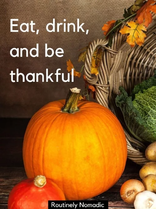 Eat, drink, and be thankfulin a ball front of the lying on his