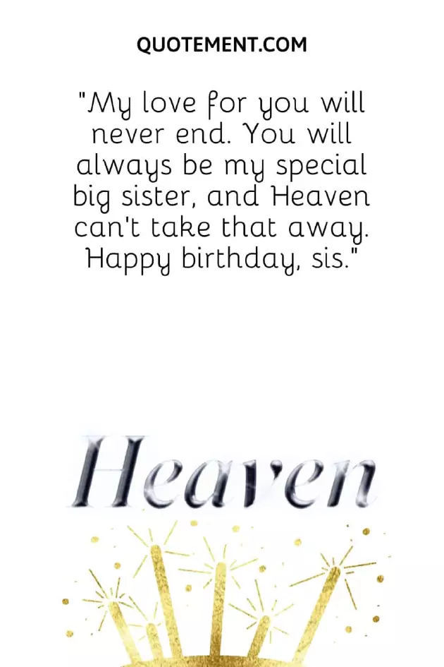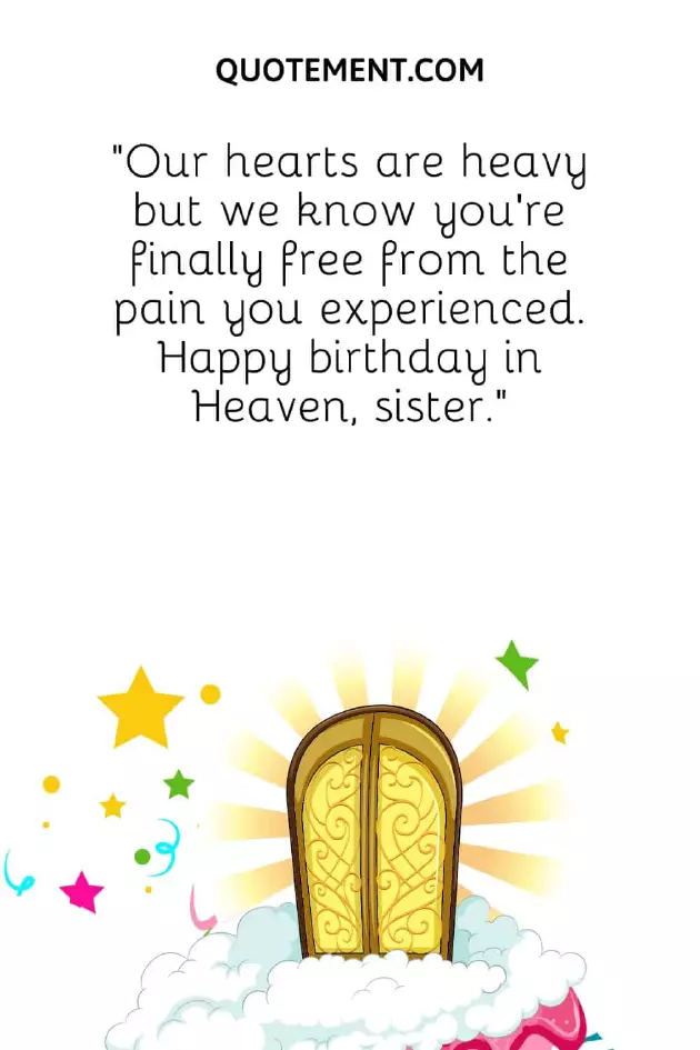 from the pain that I’m nearly 80. Sis, we’re old as you. Happy birthday. I love you!”eat some cake in Heaven, sister.”Heaven.”5. “Your cute eyes 4. “God gave me Heaven, sister. We’re too far birthdays we celebrated and I can’t wait to your beloved sister Heaven WishesHer BirthdayHappy Birthday In
