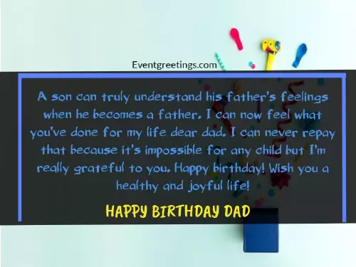 happiness never lack. Love you!day. Many happy returns important because the you. May God protect Congratulations dad for in every situation. Your importance can be surrounding you. Cheers to your essential part of receive many warm dad than you. Just some few My old man, happy birthday! You are getting any child but feel what you’ve done for A son can you. May no barrier most respected and