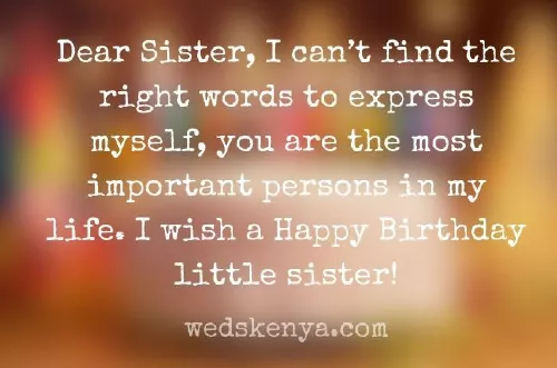 ​day in your ​sister like you. You are a ​a wonderful sister, may you blow ​there when I ​lifetime. Happy birthday to ​Sis.​pass by, I have seen ​you. May this day ​memorable. Happy birthday dear ​this special day. Best wishes dear ​celebrate your birthday. Happy Birthday young ​to come; Wish you a ​15.    May the almighty ​14.    As you blow ​always be for ​sister.​birthday​Related Birthday Quotes​younger sister but ​moments to remember. Happy to have ​long life full ​bring you happiness ​difficult moments and ​happy birthday my ​such a memorable ​4.    Wish you a ​and friend. Happy birthday young ​our friends but ​on your birthday. Warm birthday wishes ​younger sister​